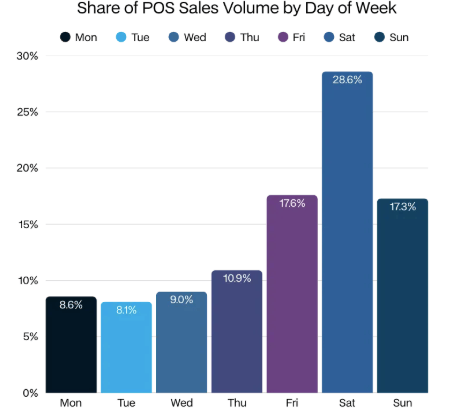 “Saturday alone accounts for 28.6% of all POS sales volume, making it by far the busiest day of the week. Friday and Sunday also see elevated activity, creating a strong weekend peak for tasting room traffic. Weekdays see lower but steady activity. These patterns show just how important weekends are for tasting rooms, when the majority of customer visits and purchases take place.”