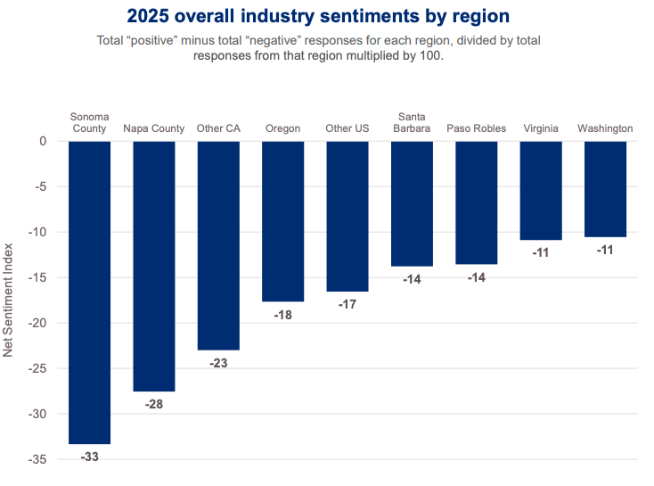 “Wineries express deep concern about the economy, consumer demand, labor availability, substitute products and capital costs. Only grape supply and water availability sit in neutral or mildly positive territory. Regionally, sentiment varies widely. Washington and Virginia show the least pessimism. Napa and Sonoma show the most. The pattern aligns with cost structures, shifts in tourism and visitation, and regional DTC dynamics.”