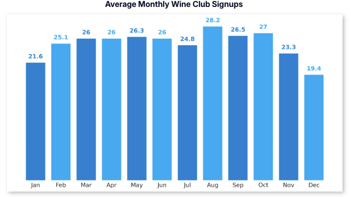 “In North America, wine club signups and cancellations follow clear seasonal patterns. Signups remain steady throughout the year, averaging around 25 per month, with meaningful lifts in late summer and early fall. August and October see the highest activity, reflecting periods when wineries drive the most traffic, club promotion, and on-site engagement. December consistently shows the lowest signup activity (19.4), suggesting a slowdown in acquisition during the holiday period.”