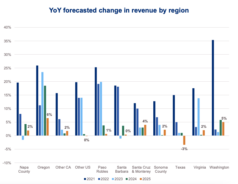 “Industry-wide, premium wineries expect essentially flat dollar sales in 2025. But the aggregate masks important variations. Oregon and Washington expect mid-single-digit growth, while several regions project declines. The smallest and largest premium wineries anticipate growth, while mid-sized producers expect contraction. It’s been decades since we’ve seen this phenomenon, but being stuck in the middle – too big to take a DTC focus and too small to get distributors to sell your brand is something to be avoided.”