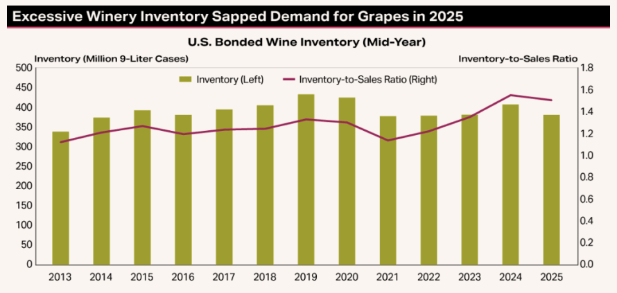 “The chart illustrating excess wine inventory shows bonded wine stocks held by U.S. wineries, including both finished (bottled) and unfinished (bulk) wine, as of June 30 each year, as well as the inventory-to-sales ratio over the prior 12 months. The current inventory-to-sales ratio stands at about 1.5, equivalent to just over 18 months of supply based on past 12-month sales. This compares with an average of less than 1.25 (14.8 months) from 2014 to 2018, a period when inventories were thought to be roughly in balance. Thus, inventories are clearly high relative to historical levels.”