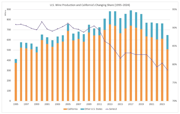 “Total U.S. wine production peaked in 2017 at 891 million gallons before falling 27% by 2024. California, once accounting for more than 90% of the U.S. total, dropped to 78.5% in 2024 — its lowest share in more than two decades.”
