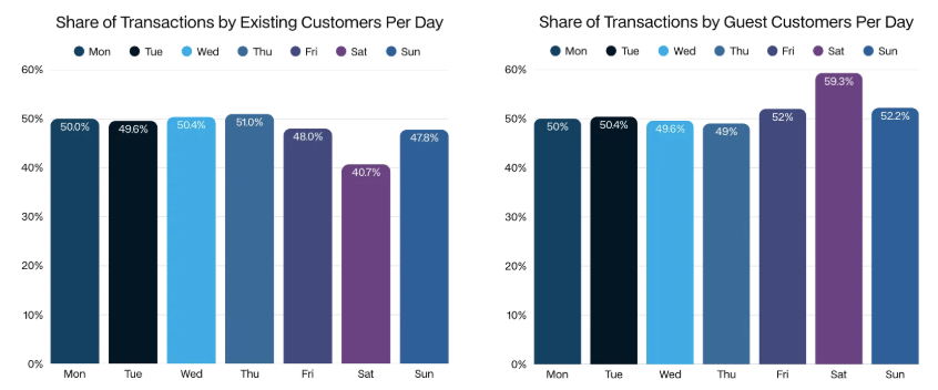 “Across most days of the week, POS transactions are split fairly evenly between known and guest customers. However, that balance shifts during peak tasting room traffic. On Saturdays, nearly 60% of transactions are processed as guest purchases, compared to roughly 50% on most weekdays. This suggests that the busiest tasting room days are also when wineries are most likely to miss opportunities to capture customer information.”