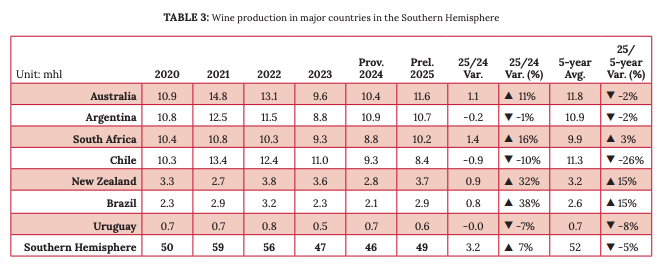 “In the Southern Hemisphere, where the wine harvest concludes during the first half of the year, preliminary estimates for 2025 point to a slight recovery in production. Performances across countries appear uneven, with some showing signs of recovery and others still facing reduced yields. In 2025, the Southern Hemisphere accounts for around 21% of global wine output, a share consistent with the past decade’s average.”